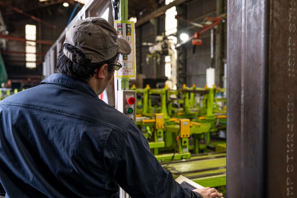 各工程から依頼を受け、図面に基づいて溶接作業を行い、溶接後はリフトやホイストを利用して次の工程へ作業の依頼をしていきます。